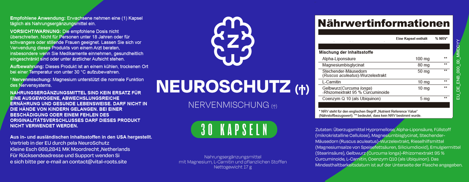 NeuroSchutz™ ist ein sorgfältig formuliertes Nahrungsergänzungsmittel zur Unterstützung der Nerven mit Magnesium, Alpha-Liponsäure, L-Carnitin, Curcumin, Coenzym Q10 und Pflanzenextrakten — entwickelt zur Unterstützung der normalen Funktion des Nervensystems und des allgemeinen neurologischen Wohlbefindens.